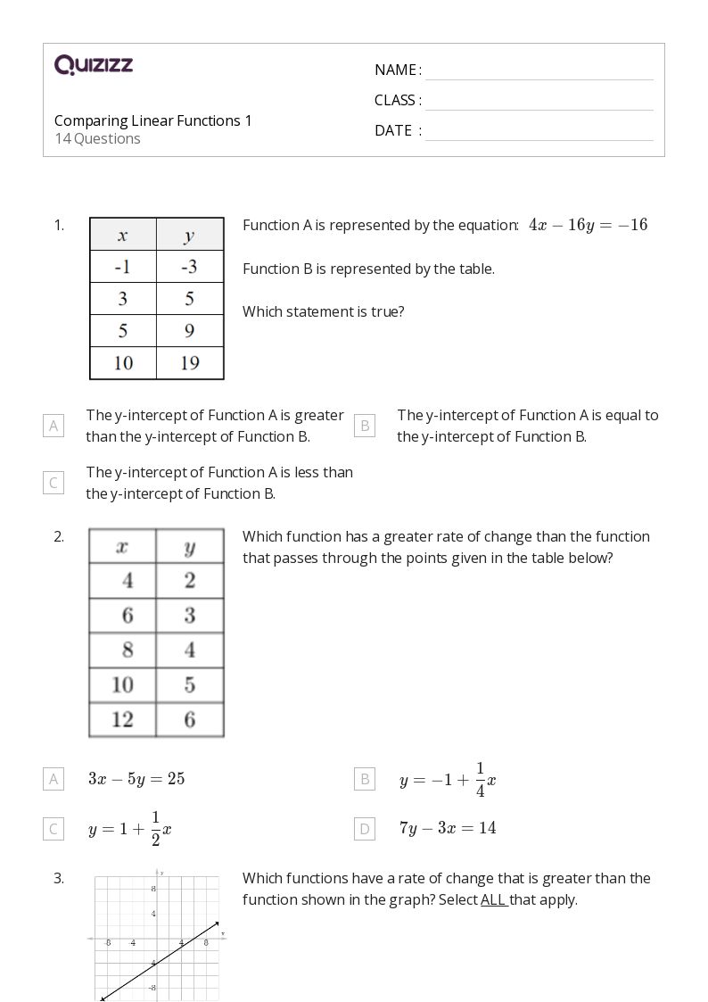 Compare properties of linear functions (rates of change and intercepts) and use this information to solve problems. He gives 4 chocolates per week to his friend. Compare inputs and outputs of functions that are represented in different ways. Compare two functions presented as tables, graphs and equations in these printable worksheets.